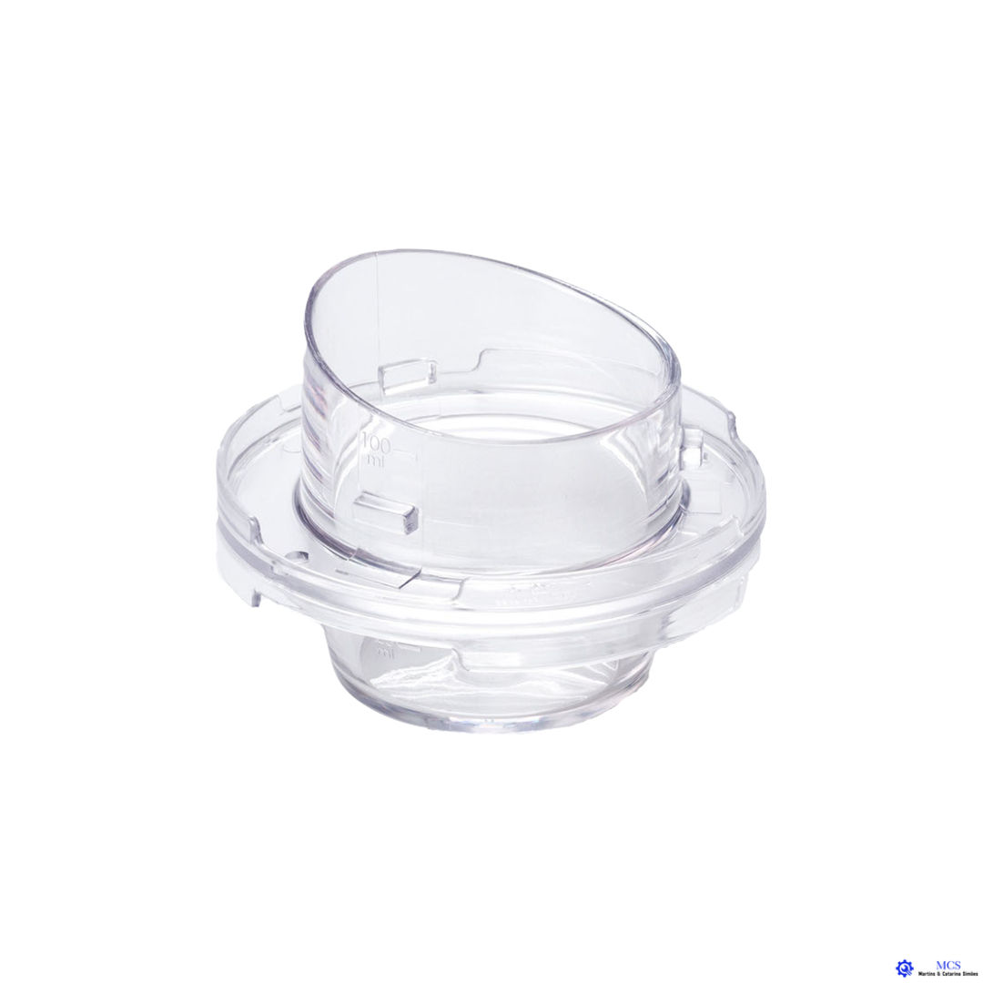 Copo transparente com capacidade para 100ml, permite medir, uma vez que está graduado, a quantidade de alguns alimentos e introduzi-los no interior do copo através do orifício na tampa do mesmo.
