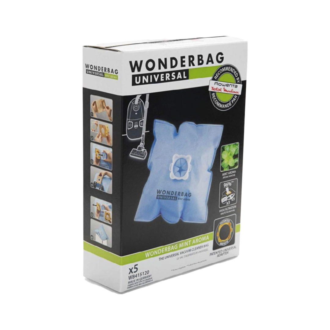 Sacos de Aspirador ROWENTA WB415120 Wonderbag MinT Aroma. Sacos bastante resistentes com 3 niveis de filtragem, com uma retenção de até 96% de partículas. Este modelo de saco tem um agradável perfume a menta que se espalha pela casa.